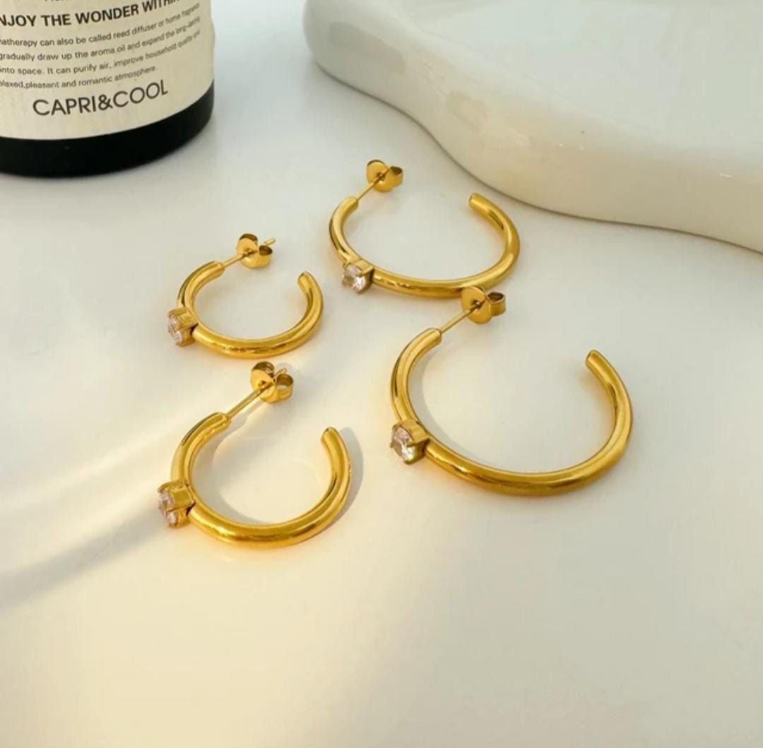 Stainless steel,18k gold plated,hypoallergenic,non-tarnish,water resistant & Sweat proof (can shower or swim with)