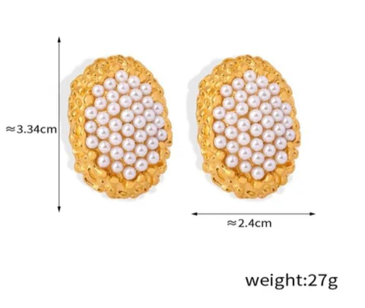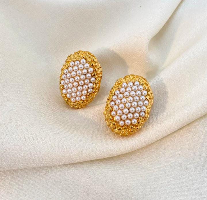Oval Honeycomb stud earrings freshwater pearl (REAL PEARL)
