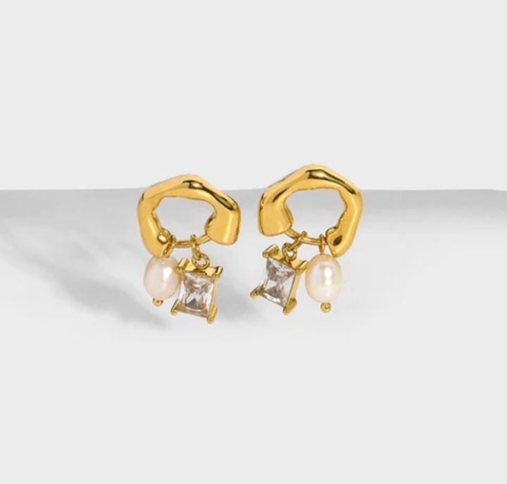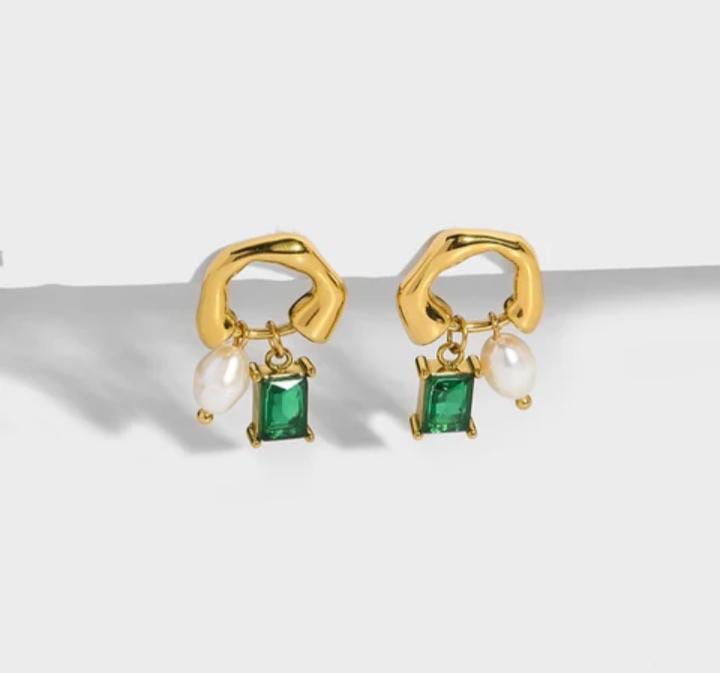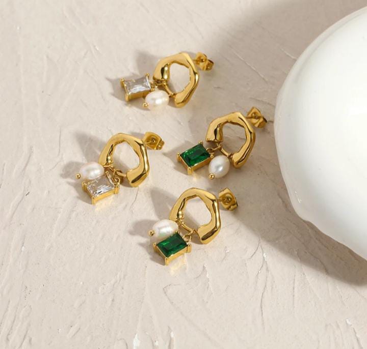 Stud pendant earrings White/Green zircon freshwater pearl (REAL PEARL)